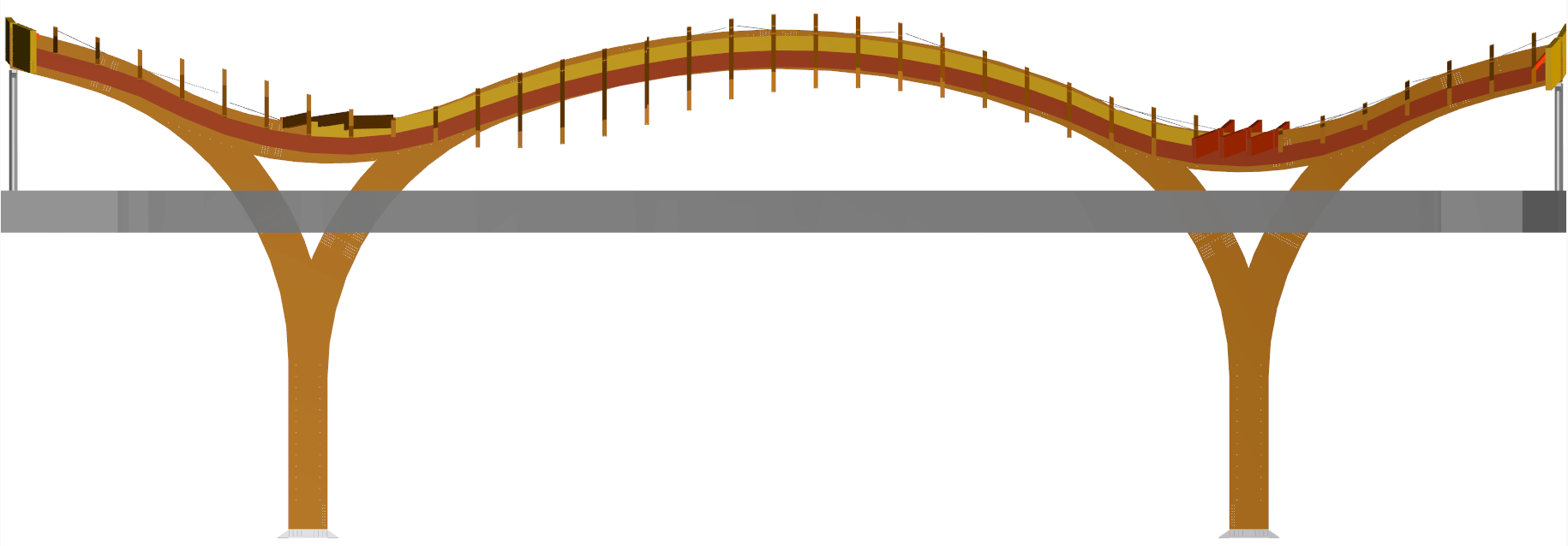 La struttura è estremamente irregolare sia in pianta che in sezione, realizzando l'effetto di "alberi" in legno che sorreggono una copertura simulante delle onde.